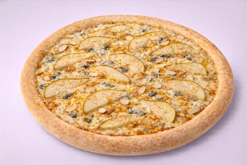 ФИРМЕННОЕ ТЕСТО, СОУС БЕШАМЕЛЬ, МОЦАРЕЛЛА, СЫР С ПЛЕСЕНЮ, ГРУША, САХАР ТРОСНИКОВЫЙ, ЛЕПЕСТКИ МИНДАЛЯ. 33см