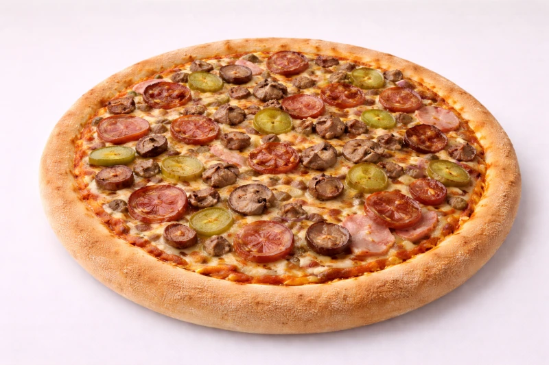 ФИРМЕННОЕ ТЕСТО, СОУС ТОМАТНЫЙ, МОЦАРЕЛЛА, ВЕТЧИНА, ГРИБЫ ЖАРЕННЫЕ, КОЛБАСКИ ОХОТНИЧИИ, ОГУРЦЫ МАРИНОВАННЫЕ, КРАСНЫЙ ЛУК. 33см