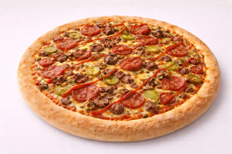 ФИРМЕННОЕ ТЕСТО, СОУС ТОМАТНЫЙ, ХАЛАПЕНЬО, СОУС ШРИРАЧА, МОЦАРЕЛЛА, ЧЕДДЕР, ЧОРИЗО, ОХОТНИЧЬИ КОЛБАСКИ, ГОВЯДИНА, ОГУРЦЫ МАРИНОВАННЫЕ, БОЛГАРСКИЙ ПЕРЕЦ. 33см