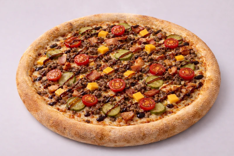 ФИРМЕННОЕ ТЕСТО, СОУС ТОМАТНЫЙ, МОЦАРЕЛЛА, ЧЕДДЕР, ФАРШ ГОВЯЖИЙ, БЕКОН, ОГУРЦЫ МАРИНОВАННЫЕ, ЧЕРРИ, СОУС УНАГИ. 33см