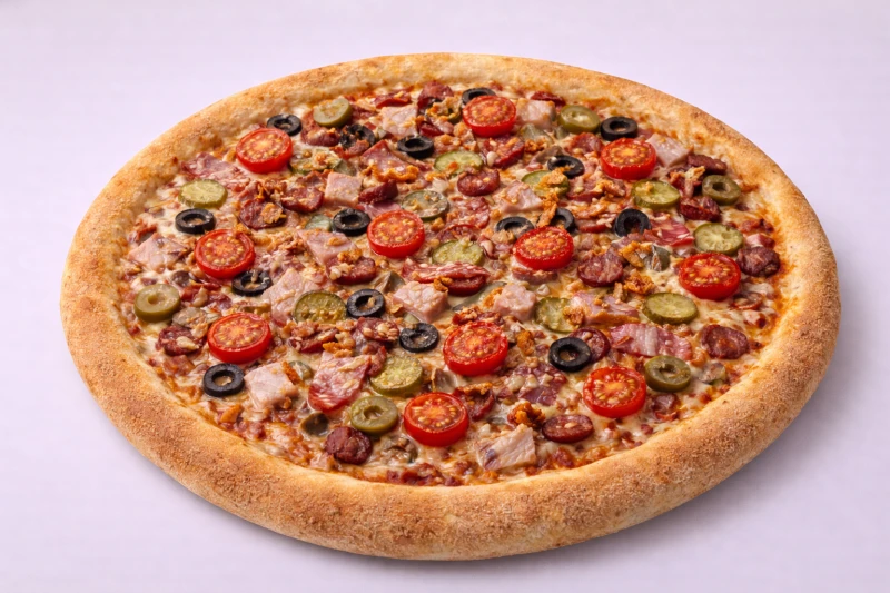 ФИРМЕННОЕ ТЕСТО, СОУС ТОМАТНЫЙ, МОЦАРЕЛЛА, ВЕТЧИНА ИЗ ИНДЕЙКИ, САЛЯМИ, БЕКОН, ОХОТНИЧЬИ КОЛБАСКИ, ОГУРЦЫ МАРИНОВАННЫЕ, ЧЕРРИ, МАСЛИНЫ, ОЛИВКИ, ЛУК ФРИ.