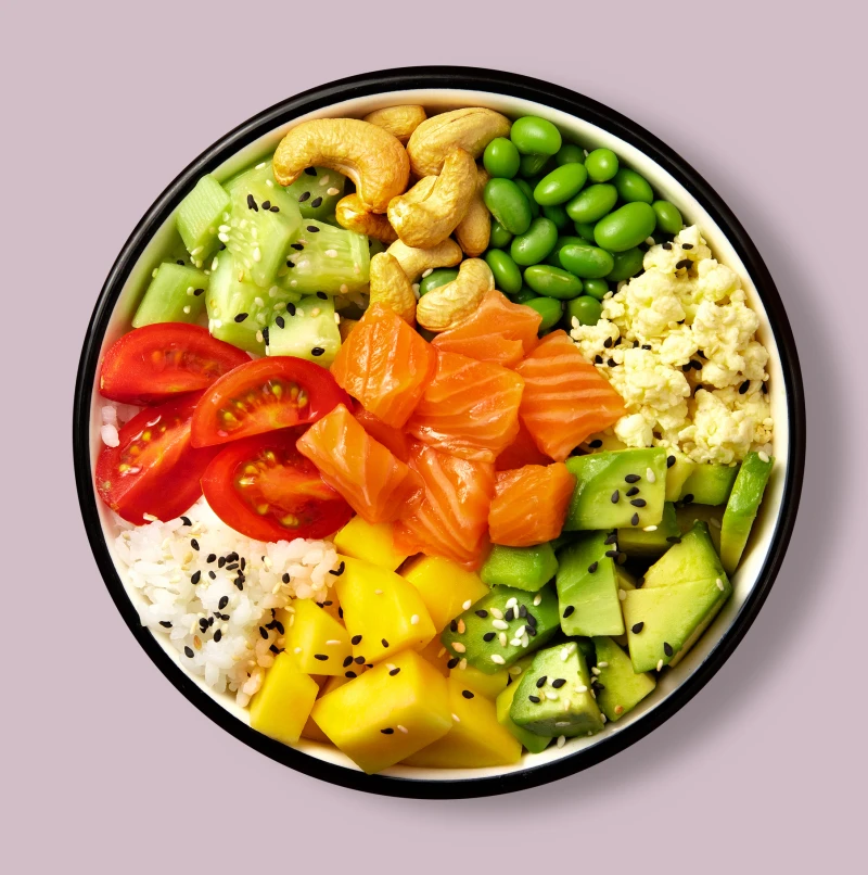 Лосось, Авокадо, Бобы Эдамаме, Помидоры Черри, Огурцы в имбирном маринаде, Скрэмбл, Манго, Орехи Кешью жареные, Кунжут. Основа на выбор : Рис или Киноа. Соус на выбор : Бомбей, Ореховый, Апельсиново-горчичный, Медово-горчичный