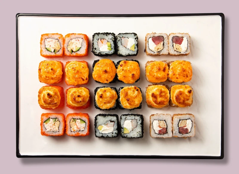Запечённый с крабом, запечённый с тунцом, запечённый с креветкой. + Соевый соус (100 мл), имбирь (25 г; 2 шт.), васаби (15 г; 2 шт.) НЕ ЯВЛЯЕТСЯ ГОРЯЧИМ БЛЮДОМ