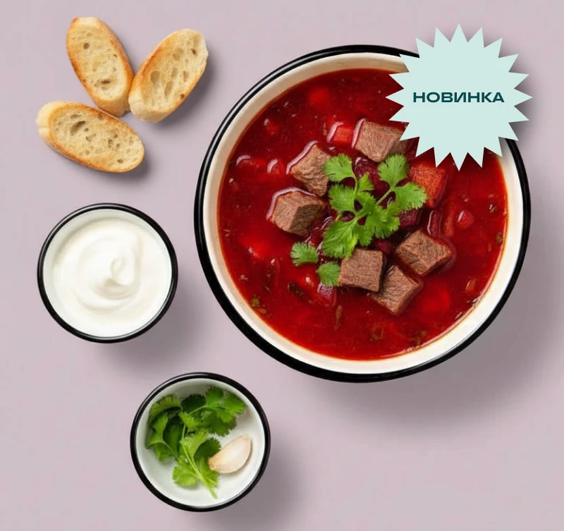 Борщ с говядиной, сметаной, багетом, зеленью и чесноком.